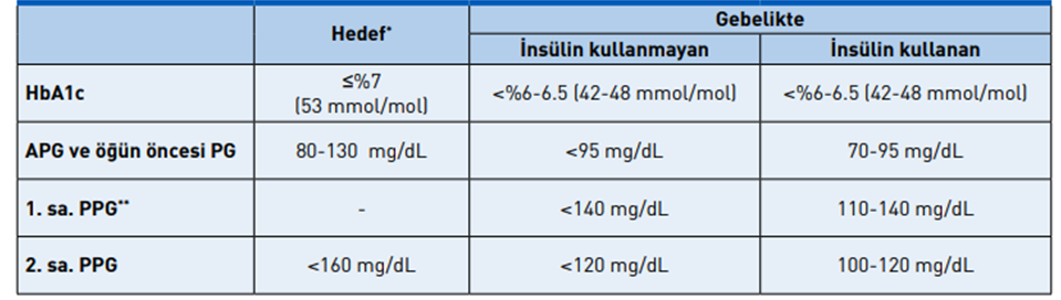 Yetişkinler ve gebelerde glisemik kontrol hedefleri tablosu: